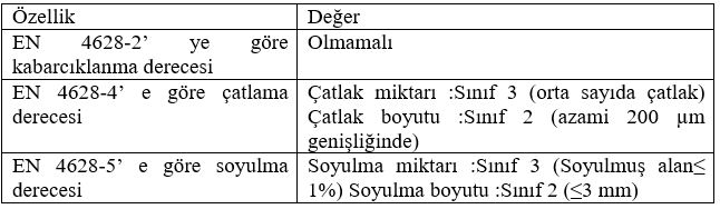 • Son kat kaplamanın ETICS sıvası üstüne yapışması ve dayanıklılığı, EN 1062-11’ e göre şartlandırma yapıldıktan sonra, prEN 4628-2, prEN 4628-4 ve prEN 4628-5’ e göre tayin edilmektedir. Tablo 4’teki değerleri sağlamalıdır.