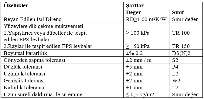 • EPS ısı yalıtım levhaları Tablo 1’deki değerleri sağlamalıdır.
